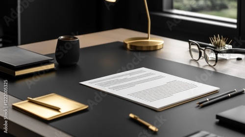 desk, workspace, office, gold, black, minimal, modern, document, paper, pen, table, elegant, stylish, accessory, design, clean, simple, professional, business, luxury, neat, organised, aesthetic, sophisticated, premium, executive, corporate, work, stationery, notebook, goggles, cup, dark, matte, decor, style, writing, instrument