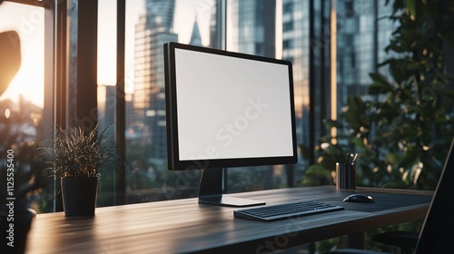 computer, desktop, monitor, keyboard, mouse, office, workspace, modern, city, city landscape, window, view, sunset, sunlight, desk, wood, table, plant, green, pot, technology, screen, blank, empty, design, minimal, clean, stylish, elegant, professional, business, work, home, room, interior, building, building, urban, contemporary, aesthetic, atmosphere, lighting, gold, hours