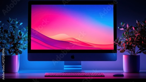 Modern Desktop Setup with Colorful Monitor and Indoor Plants