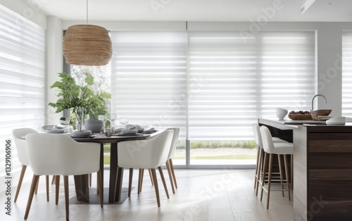interior, design, modern, dining, room, kitchen, window, shades, blind, light, bright, white, chair, table, wooden, contemporary, minimalist, home, decor, house, apartment, style, furniture, space, elegant, clean, luxury, comfort, serene, calm, peaceful, sunlight, sun, view, lifestyle, living, area, architecture, real estate, property