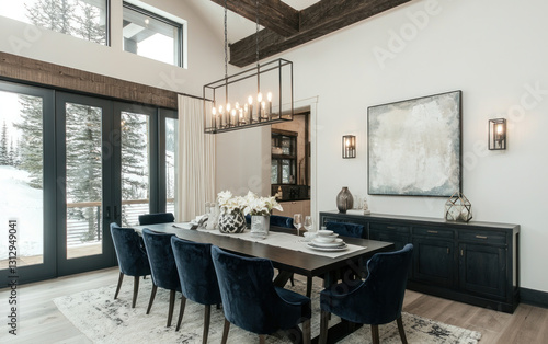 roomy, interior design, lighting, peaceful, home, table, window, residential, velvet, snow, modern, stylish, chair, design, comfortable, mountain view, aesthetic, furniture, tranquil, winter, wooden, large, serene, inviting, warm, navy blue, property, home decor, light, luxury, real estate, contemporary, style, interior, beautiful, bright, cosy, house, room, architecture, decor, elegant, dining room, rustic, chandelier