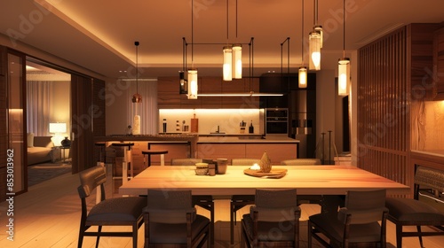 dining, room, modern, wood, table, chair, light, warm, minimalist, design, kitchen, interior, decor, home, style, contemporary, furniture, lamp, lighting, ceiling, floor, accent, cosy, elegant, comfortable, space, living, area, dinner, family, gathering, ambience, sophisticated, clean, line, open, concept, luxury