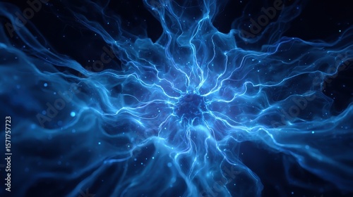 Modern dynamic blue neuron plasma energy laser. Futuristic virtual technology wallpaper, digitally generated image. 3D Rendering, no logos, no brands