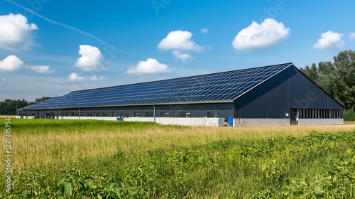 Modern Eco Friendly Farm Building with Solar Roof in Rural Field Landscape : Generative AI
