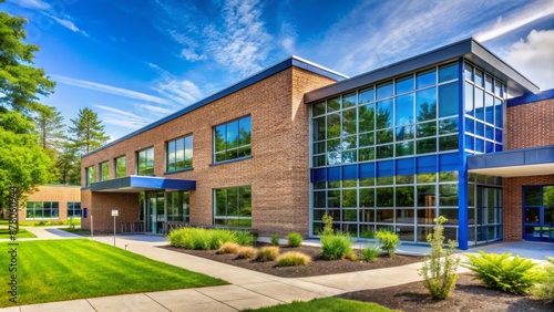 modern, eco, friendly, elementary, school, building, bright, blue, accent, large, window, lush, greenery, entrance, architectonic, trendy, minimalist, natural, organic, sustainable, cv, playground, facades, interior, structure, design, development, innovative, educational, learning, architecture, contemporary, aesthetic, harmonious, exterior, environment, surrounding