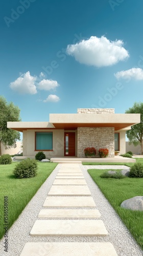 Modern Eco-Friendly Home with Stone Facade and Landscaped Garden Pathway Under Blue Sky