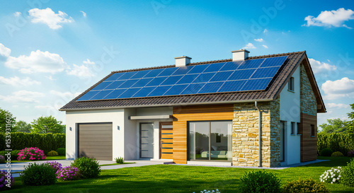 Modern Eco-Friendly House with Solar Panel Roof Under Clear Blue Sky