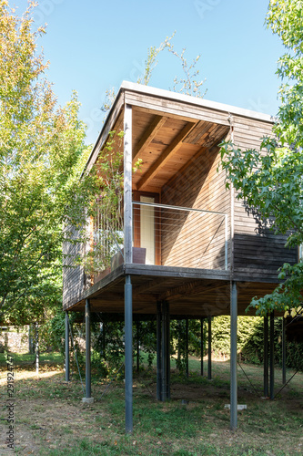cabin, pillar, elevated, modern, house, view, garden, estate, exterior, wall, window, new, contemporary, steel, stair, construction, wood, residential, lifestyle, architecture, style, outside, building, space, grass, hardwood, step, entry, design, property, nobody, home, nature, facades, build, wooden, forest, tree, post, pole, architectural, detail, vegetation, plant, balcony