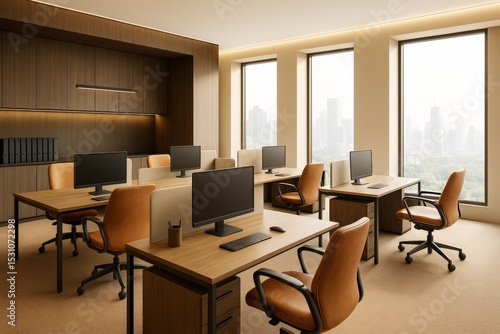 Modern empty office interior with wooden desks and leather chairs near large windows in high-rise building, contemporary workspace concept.