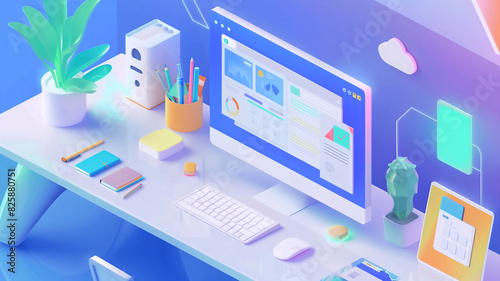 Modern empty office working place. Work table with monitor, desk, chair, computer, accessories, plants in pot. Isometric composition