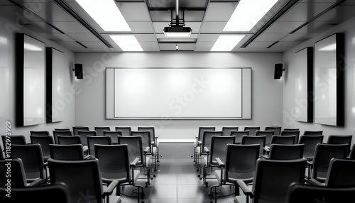 seminar, room, empty, lecture, hall, projector, whiteboard, chair, modern, interior, presentation, meeting, conference, classroom, school, office, building, architecture, design, space, minimal, clean, corporate, education, technology, display, screen, training, workshop, business, event, assembly, auditorium, campus, institution, grey, black, white, lighting, floor