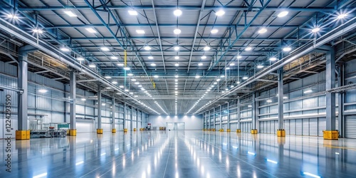 Modern factory floor with high ceilings illuminated by a vast array of energy efficient LED lights creating a bright and airy atmosphere , Industrial Lighting, Modern Factory
