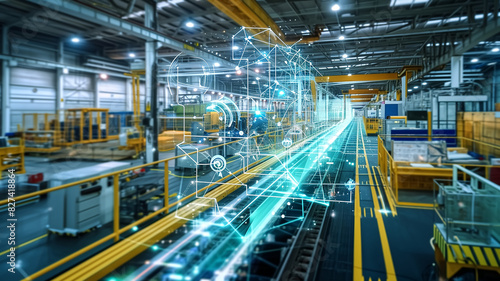 Modern factory interior with digital overlay. Futuristic holographic interface showing industrial automation and smart manufacturing process. Technology and industry 4.0 concept. Aerial view