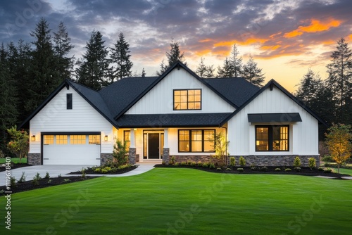 Modern farmhouse exterior dark gabled roof white siding large windows with warm lighting