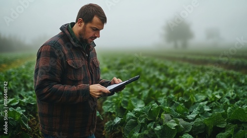 Modern Farming Technology: A focused young farmer utilizes a tablet computer amidst rows of thriving crops on a foggy morning, showcasing the integration of technology in agriculture.