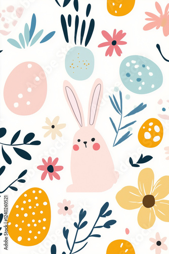 modern flat design illustration featuring flowers, eggs, and bunnies in soft pastel colors. A charming and minimalistic composition perfect for Easter, spring, and festive celebrations.