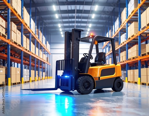 Modern Forklift in Warehouse with Shelves and Stacked Boxes Ready for Distribution