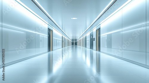 corridor, hallway, interior, design, architecture, modern, futuristic, sterile, clean, sleek, minimalist, wall, floor, ceiling, light, bright, illumination, glow, reflective, shiny, glossy, roomy, empty, vacant, calm, serene, peaceful, quiet, tranquil, white, blue, light, grey, metallic, door, panel, perspective, line, symmetry, vanishing, point, contemporary, abstract