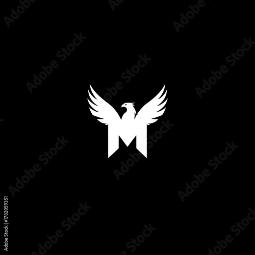 Modern geometric stylized flying bird with wings and letter M monogram logo design on black background, abstract graphic symbol