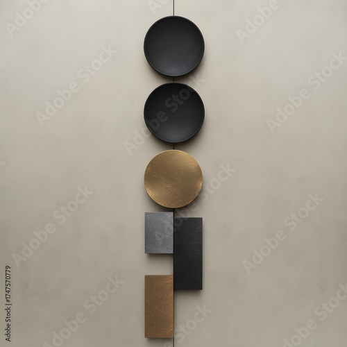 Modern geometric wall art with circular and rectangular shapes in black, gold, wood, and stone textures arranged vertically, representing balance, harmony, and minimal abstract interior design aesthet