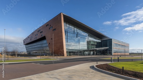 building, architecture, modern, office, glasses, wood, exterior, facades, contemporary, design, commercial, structure, corporate, business, sky, sun, day, sunlight, urban, landscape, real estate, property, development, construction, innovation, technology, sustainable, efficient, professional, workplace, environment, piazza, pathway, entrance, window, wall, park, green, driveway, parking, yard, grass, road, street, city, town, area, district