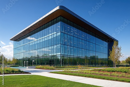Modern Glass Office Building with Green Landscaping and a Clear Blue Sky