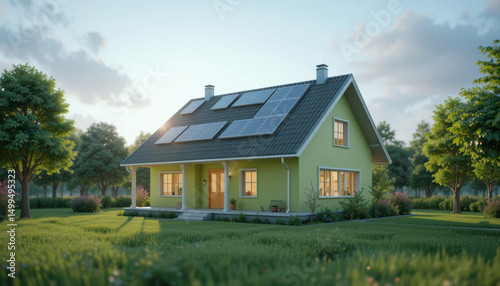 Modern green house featuring solar panels, surrounded by lush greenery and trees, embodies sustainable living and clean energy
