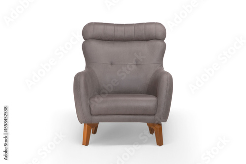 armchair, chair, furniture, isolated, white background, modern, grey, comfortable, home, decor, interior design, living room, nobody, front view, contemporary, stylish, cosy, upholster, fabric, textile, soft, elegant, object, studio shot, relaxation, minimalist, seating, single object, design element, comfort, clean, house, apartment, lifestyle, new, for sale, catalog, clipping path