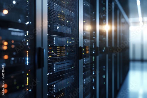 Modern high performance data center with illuminated server racks and secure network infrastructure, ideal for cloud storage, hosting, and enterprise IT solutions