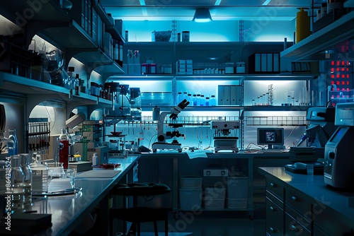 Modern, high tech research laboratory or science lab interior at night with no people and blue lighting. Concept of scientific discovery, innovation, biotechnology, and medical research