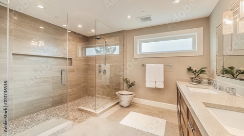 modern, bathroom, glasses, shower, partition, contemporary, design, elegant, clean, bright, roomy, fixture, tile, decor, luxury, white, sink, towel, mirror, light, interior, architecture, style, calmness, plant, warmth, minimalism, comfort, hygiene, space, renovation, aesthetic, chic, fluffy, floor, neutral, ambience, relaxing, natural, fresh, flooring, wall, element, upscale, detail, soothing, arrangement, quality