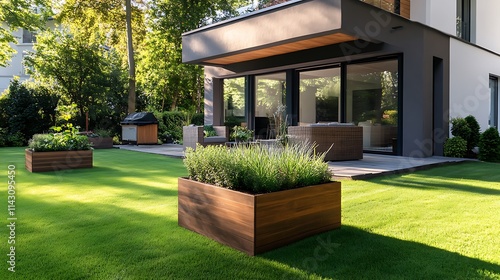house, home, garden, backyard, lawn, grass, green, plant, herb, modern, contemporary, architecture, design, patio, furniture, grill, summer, sunlight, landscaping, raised, bed, planter, box, luxury, lifestyle, residential, property, real estate, nature, environment, serene, peaceful, relaxation, comfortable, roomy, elegant, beautiful, scenic, view, exterior, dwelling, building, area, yard, landscape, estate