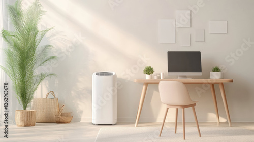home, office, portable, air, conditioner, wooden, desk, modern, chair, computer, indoor, plant, natural, light, minimalist, design, cosy, workspace, white, wall, clean, aesthetic, setup, cooling, work, environment, decor, sunlight, green, plant, wicker, basket, neutral, tone, simple, interior