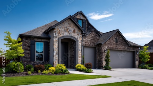 landscaping, residence, driveway, mortgage, neighbourhood, serene, real estate, property, suburban, residential, calmness, peaceful, investment, luxury, window, upscale, entranceway, new house, garage, lawn, elegant, comfortable, home, stylish, cloud, door, modern, house, outdoors, shutter, sky, design, blue skies, construction, exterior, building, facades, beautiful, brick, sunny, architecture, stone, day