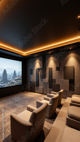 Modern home theater with acoustic panels and comfortable seating.