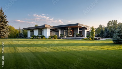 modern, house, contemporary, architecture, residential, property, home, exterior, lawn, grass, landscaping, tree, foliage, greenery, nature, outdoors, daylight, blue, sky, sunlight, real, estate, suburban, countryside, roomy, elegant, sleek, design, minimalist, glasses, building, door, luxury, window, brick, garden, front, roof, new, villa, construction, family, yard, lush, green, mature