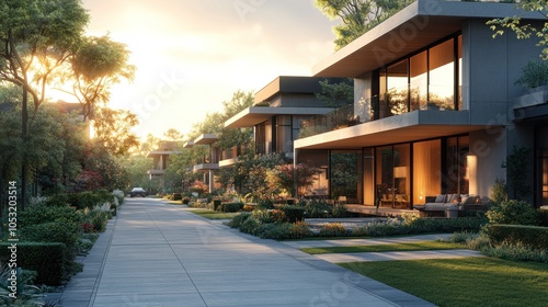 Modern homes lined along a serene street at sunset.