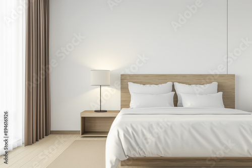 Modern hotel room interiors in neutral colors with a bed placed next to a large window. Commercial interior design composition.