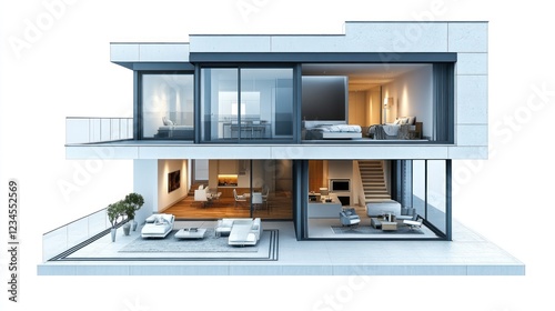 Modern house architectural cutaway, night interior, exterior design, real estate