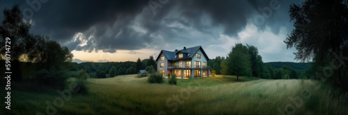 Modern house at sunset, sunset house landscape, panorama, Bauhaus style. Share Prompt