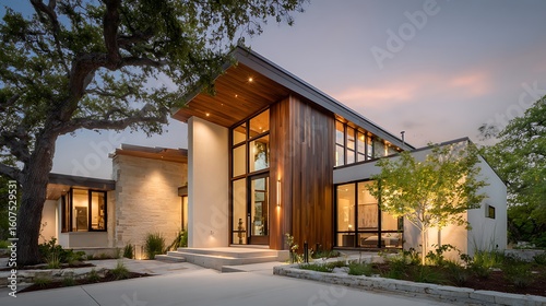 house, architecture, modern, exterior, design, home, building, residential, luxury, contemporary, wood, stone, facades, glasses, sunset, dusk, twilight, illumination, landscaping, outdoors, stylish, elegant, upscale, property, real estate, mortgage, construction, architectural, lifestyle, family, suburban, residence, dwelling, entrance, paseo, paver, warm, light, building exterior