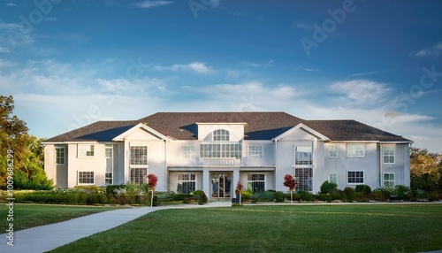house, home, architecture, exterior, building, residential, estate, sky, grass, suburban, lawn, luxury, brick, front, garden, yard, family, residence, real estate, new, property, roof, door, villa, real
