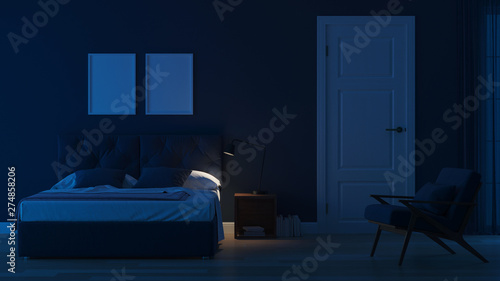 Modern house interior. Bedroom in blue tonnes. Night. Evening lighting. 3D rendering.