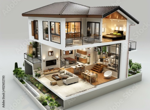 house, interior, design, modern, architecture, apartment, living, room, kitchen, bedchamber, sectional, view, visualisation, three-dimensional, rendering, home, plan, layout, furniture, lighting, space, open, concept, style