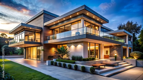 luxury home, luxury home, architecture, design, real estate, property, estate, home, house, backyard, patio, deck, garden, landscaping, grass, lawn, tree, shrub, plant, flower, paseo, path, step, evening, dusk, sunset, twilight, sky, cloud, light, lighting, illuminated, night, residential, suburb, exterior