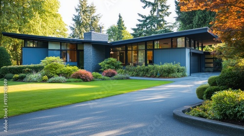 house, modern, home, yard, lawn, garden, tree, driveway, blue, building, architecture, residential, property, estate, real, suburban, neighbourhood, green, lush, foliage, plant, shrub, bush, flower, pathway, pavement, asphalt, concrete, garage, window, door, roof, design, landscape, scenic, view, exterior, facades, structure, construction, dwelling, abode, residence, suppressing, attracted, attractive, beautiful, serene