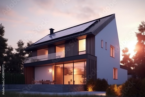 Modern house with photovoltaic solar panels on the roof, house with solar energy system, Generative AI