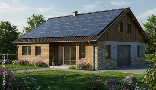 Modern house with solar panels and landscaping in a suburban area promoting sustainable living and eco-friendly concepts.
