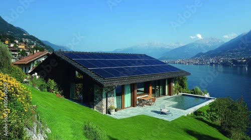house, modern, home, solar, panel, energy, sustainable, hilltop, lake, mountain, water, sky, blue, green, grass, tree, landscape, view, window, roof, stone, patio, pool, deck, chair, table, summer, nature, architecture, design, residential, luxury, serene, idylli, peaceful, tranquil, beautiful, scenery, horizon