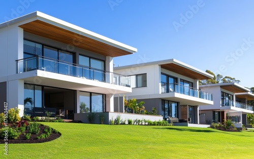 Modern houses with balconies and landscaped lawns under a clear blue sky.